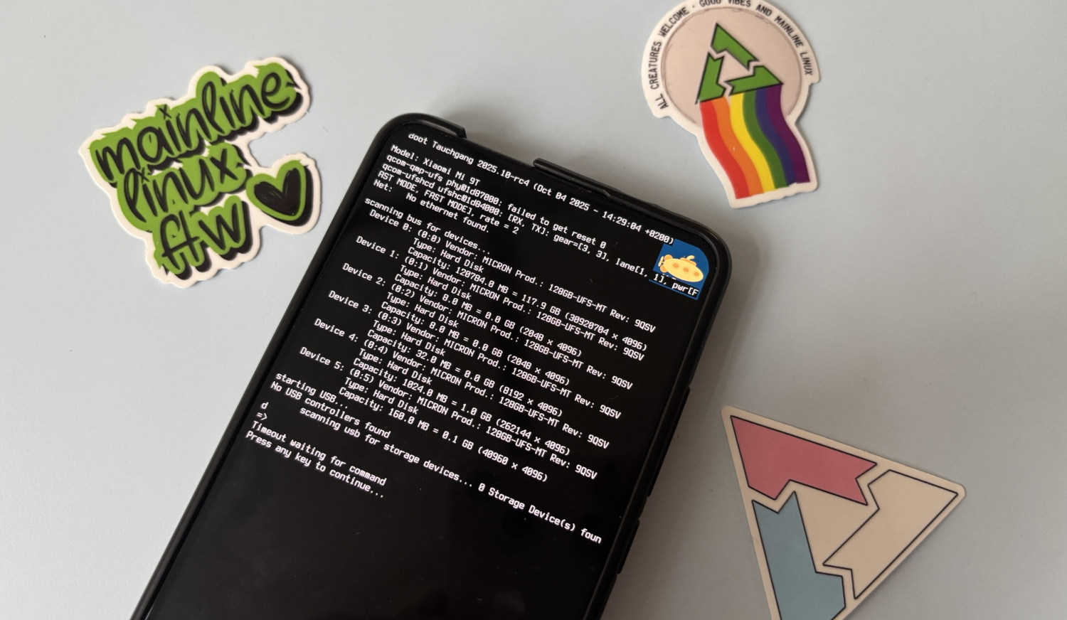 Welcome to the latest edition of what happened in the last (two) months of postmarketOS development! This time we kick it off with a photo of a Xiaomi Mi 9T running the new Tauchgang project, more on that below. It was taken at BTO7, one of the many events where we hung out lately. Others include XDC, Datenspuren (pmOS flashing stand, pmOS talk, Linux on smartphones talk), KDE Akademy 2025, FrOSCon 20 (FOSS on mobile stand, pmOS talk), WHY2025, and DEF CON 33. Thanks to all who attended and represented postmarketOS and Linux Mobile there!