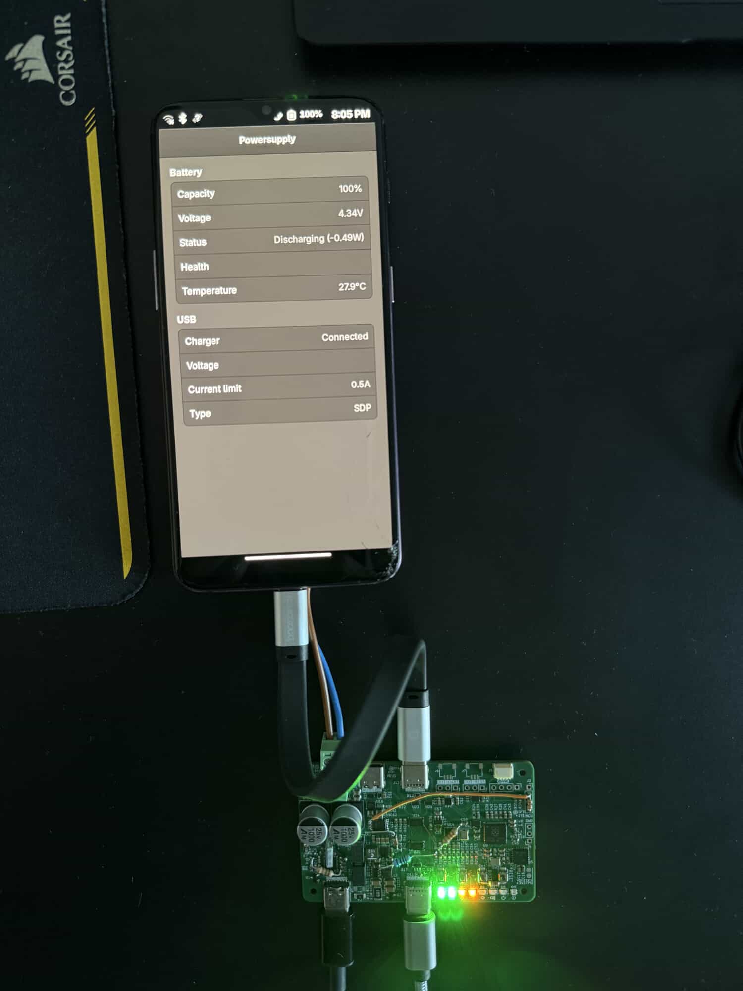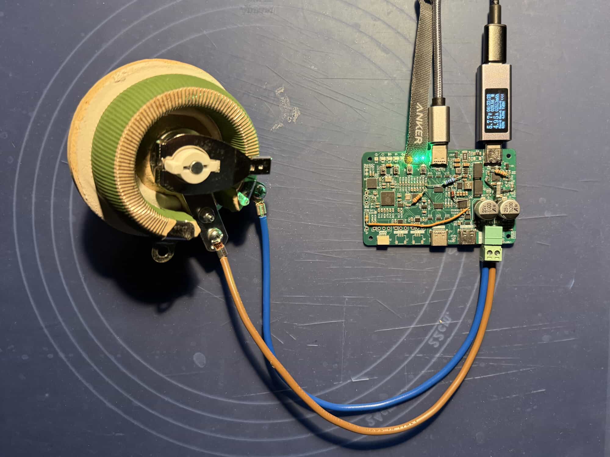 A photo of hand-patched v0.1 PCB powering a OnePlus 6T. The phone is running powersupply on phosh A photo of hand-patched v0.1 PCB connected to a 100W rheostat for 5A load testing