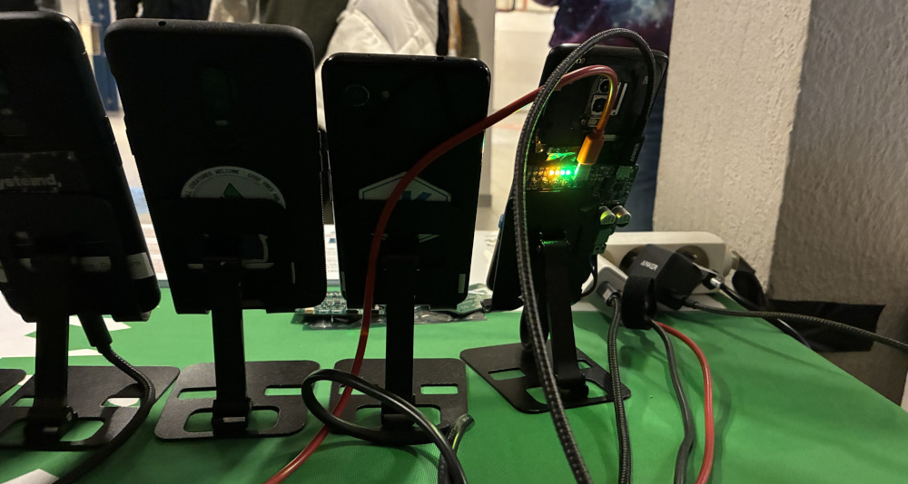 The other side of the stand, where one can see the PCB that the phone on the right was connected to. Federico, who created it together with Nicola, was there in person and happily talked to the many people interested in our hardware CI setup.